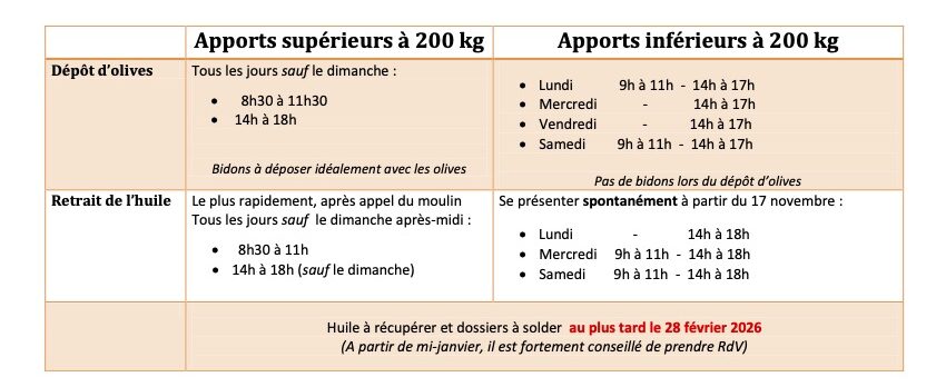 Cette année, les créneaux horaires d’apport et de restitution d’huile ont été modifiés
